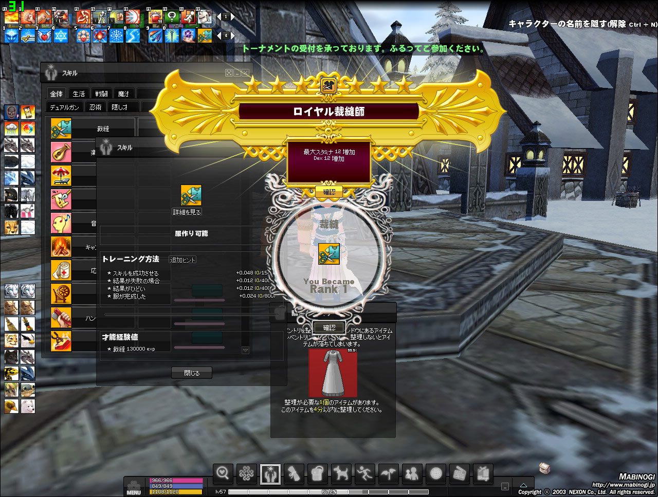MPつきつつも、ここ最近の日課をこなし、ついに裁縫1になった!!きゃっほう!!