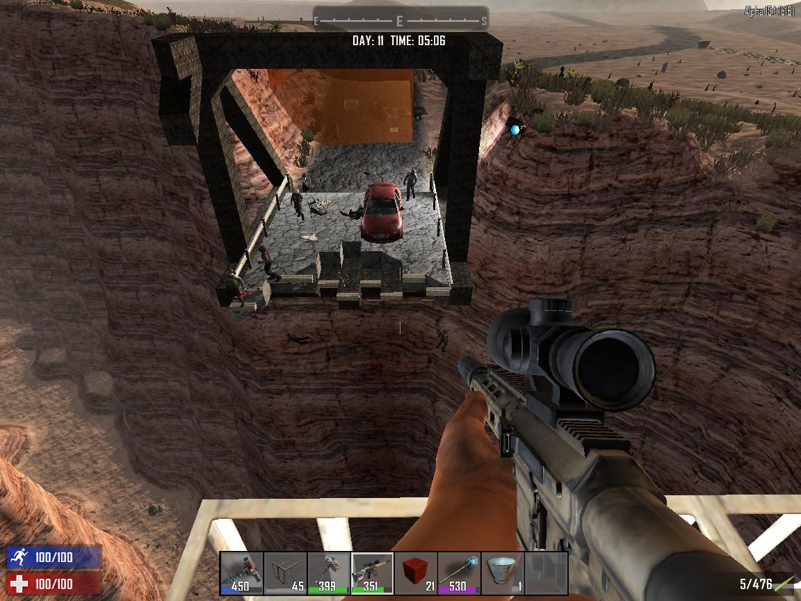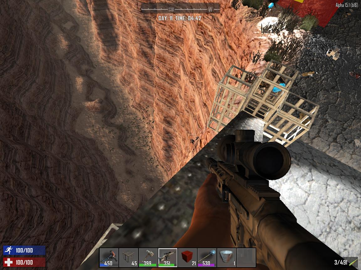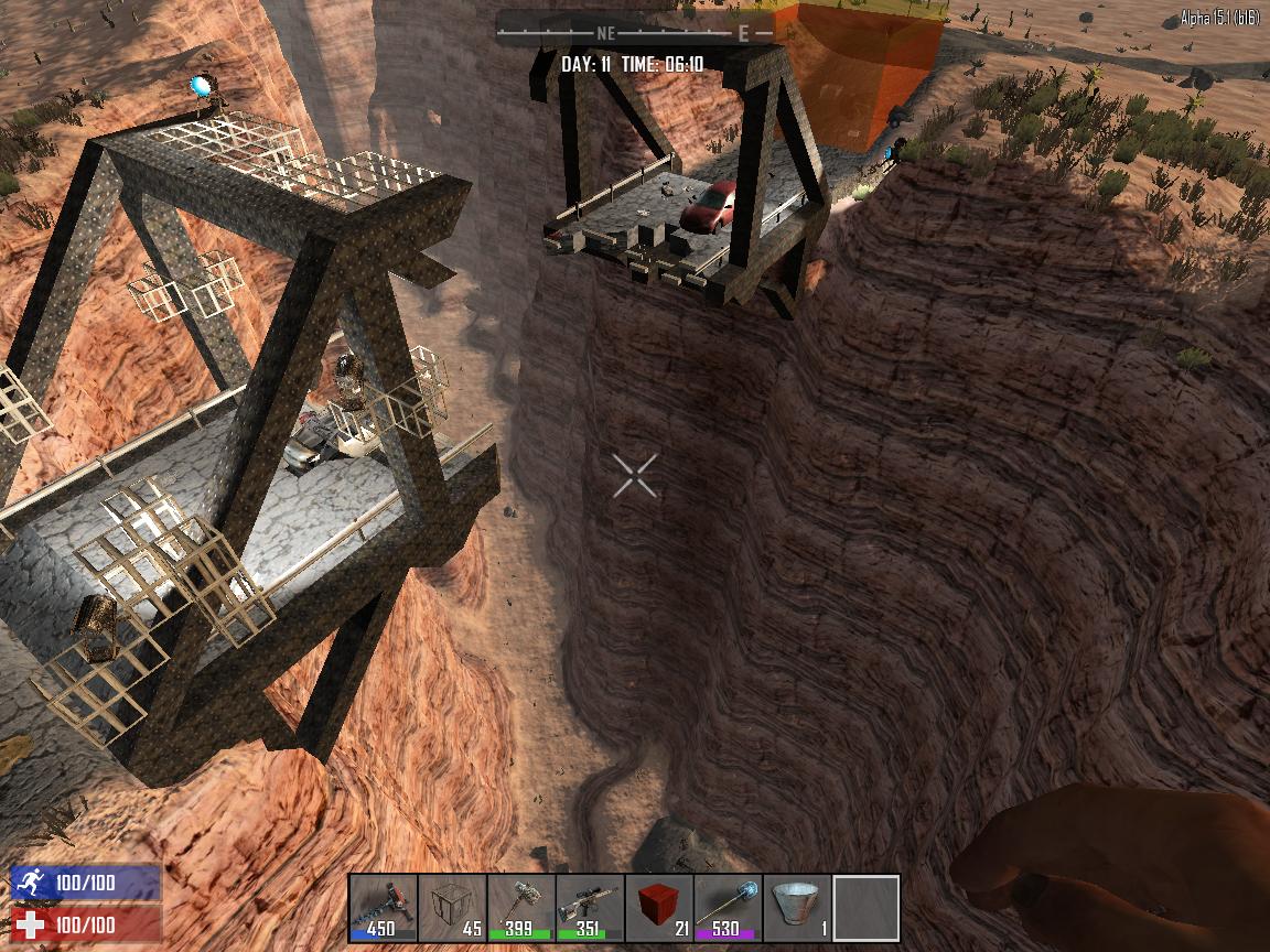 7日目ホードを終え、一人鯖は別にもういいか・・・と思ったものの、なんか面白いホードの乗り切り方ないかなーとふんわりと考え、固定マップ南西の渓谷あたりに空中拠点を築いたらただ見てるだけになるのではないか!?というひらめきがきた