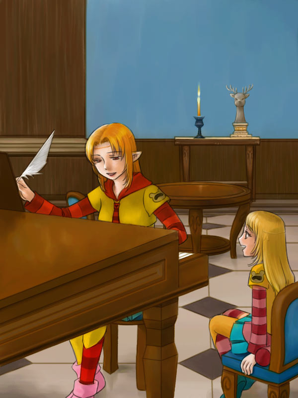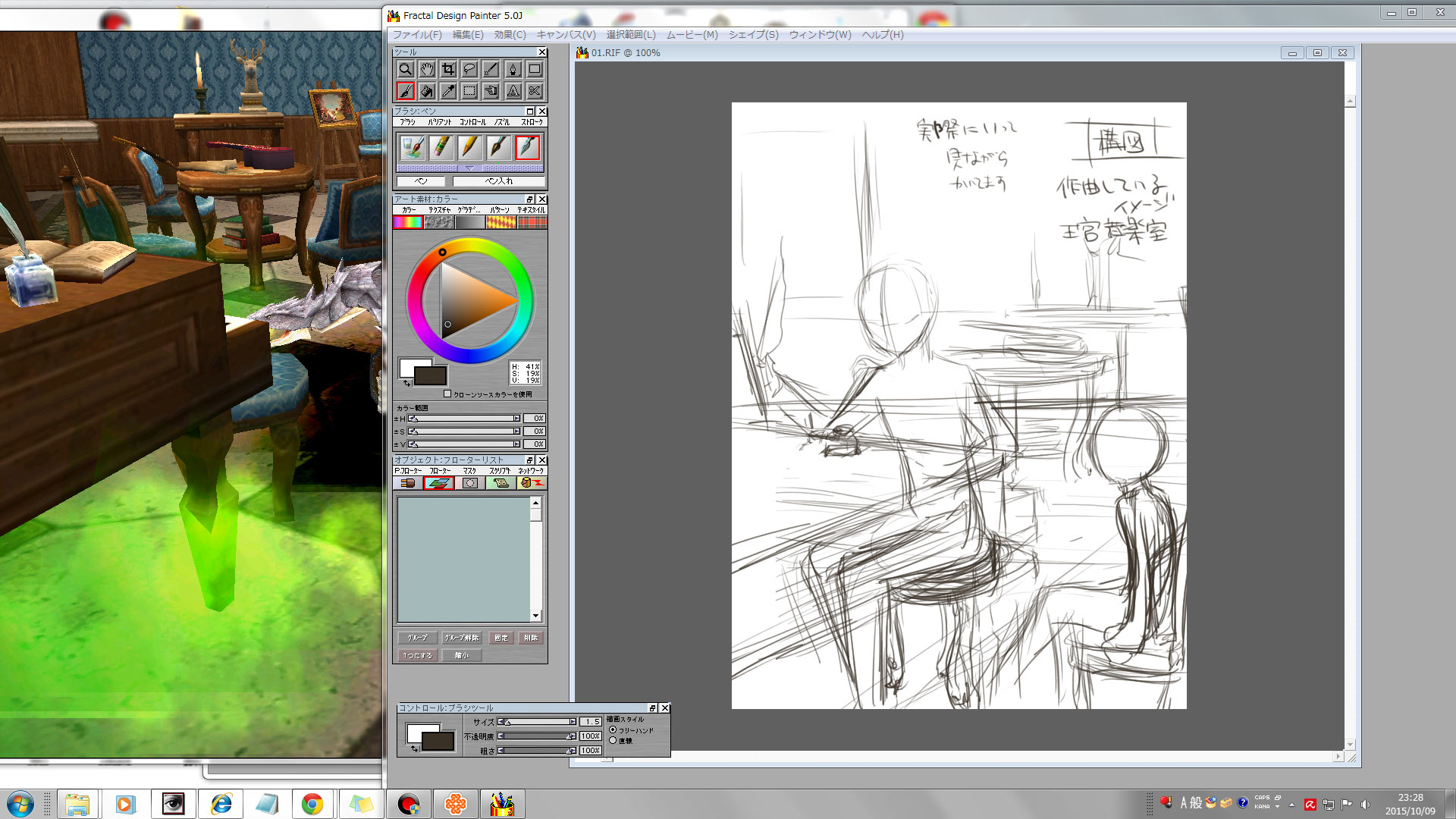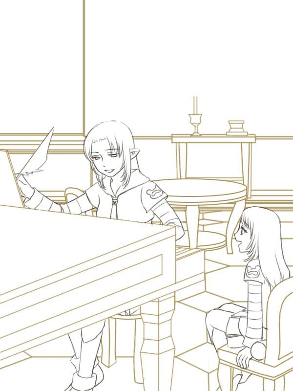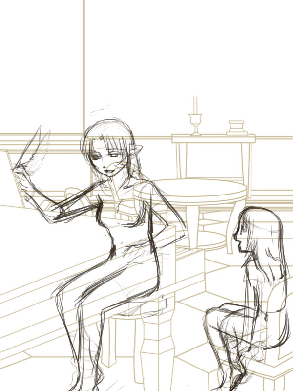 下書きで頭身などは決めてあるので、家具との折り合いをつけつつ、変じゃない程度にテケトーに描いてます