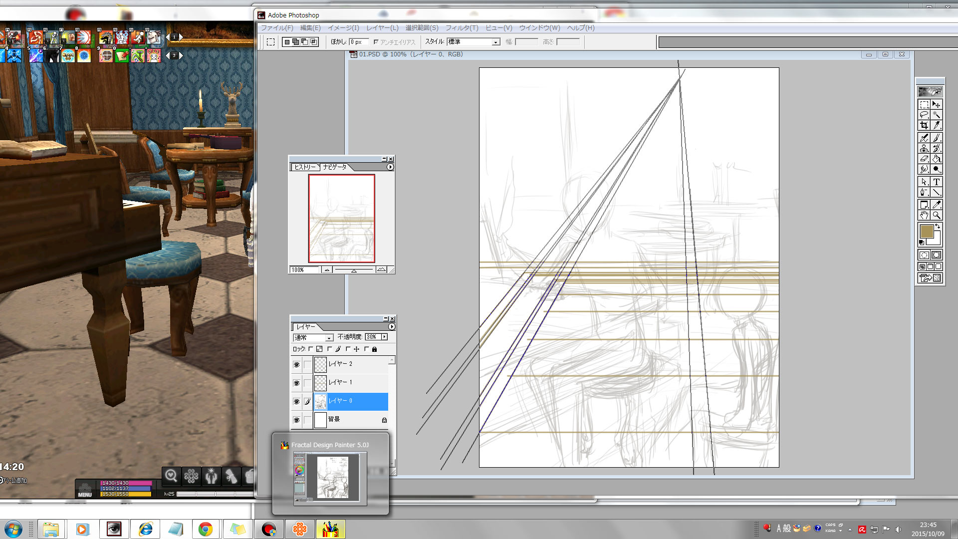 今回は背景を描く事にしました。自然物ではないため、消失点の展開がしやすいフォトショップで背景の主線を描きます
