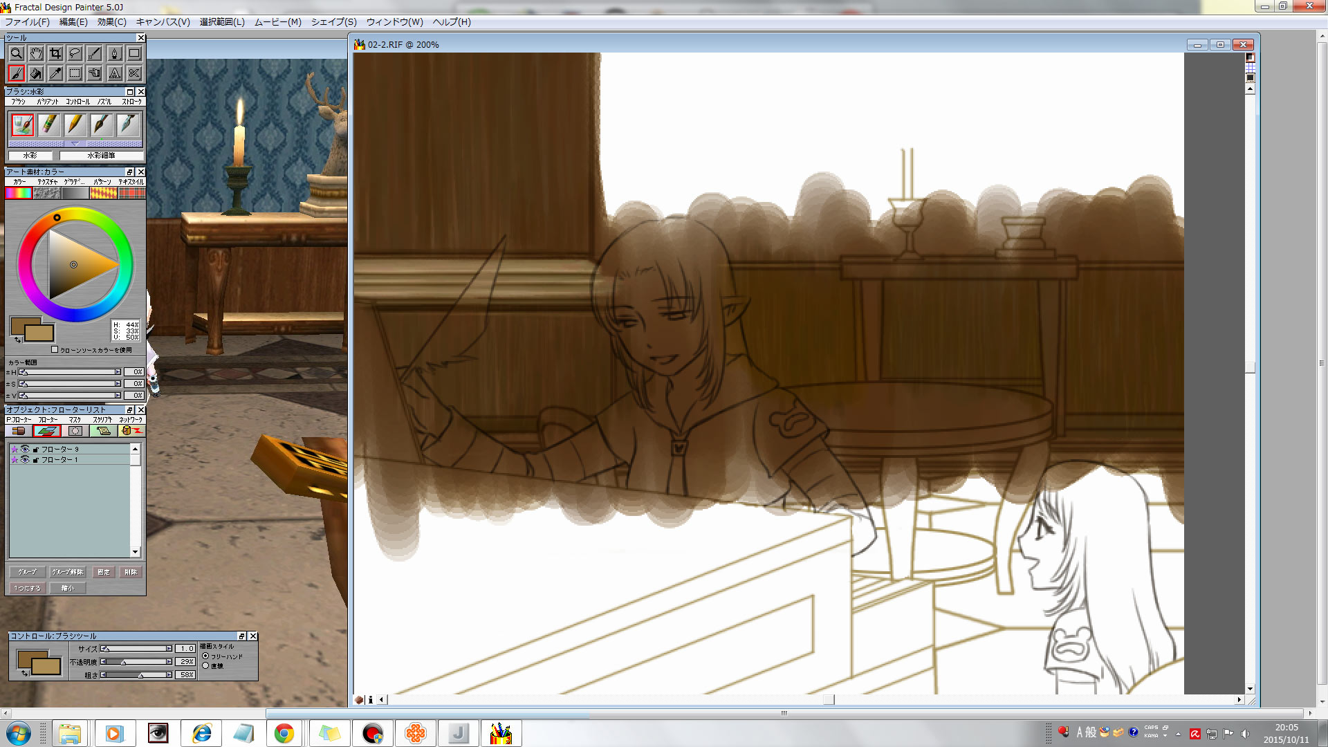アニメ塗りならフォトショップで彩色しますが、自分は軽めのタッチが好きなので、ペインターの水彩です